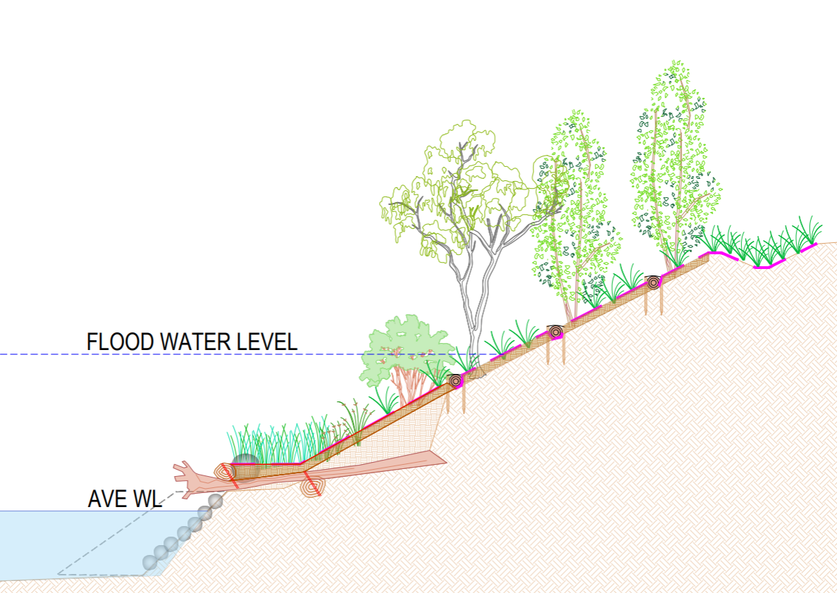 A section of riverbank is eroding due to limited vegetation and large flood events. This project provides a solution to re-stabilise the stream bank and mitigate further environmental damage and loss of land using a Bio Engineered intervention.