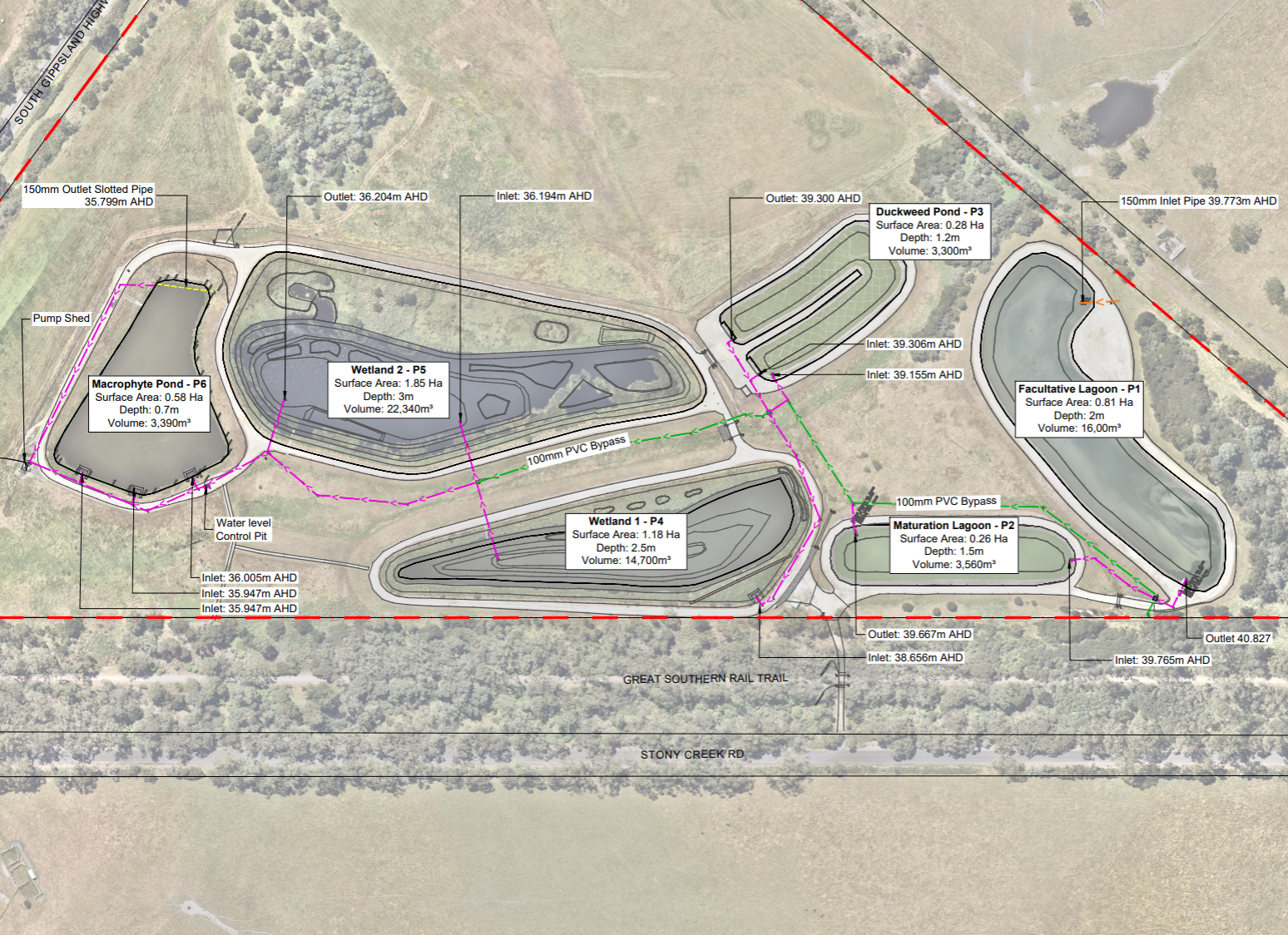 Meeniyan Wastewater Treatment Plant (WWTP) is a lagoon-based treatment plant. The WWTP was designed to treat Meeniyan’s wastewater using natural lagoon processes (i.e. no mechanical aeration or chemical dosing), with effluent polishing (i.e. nutrient removal) via a duckweed pond and wetlands.